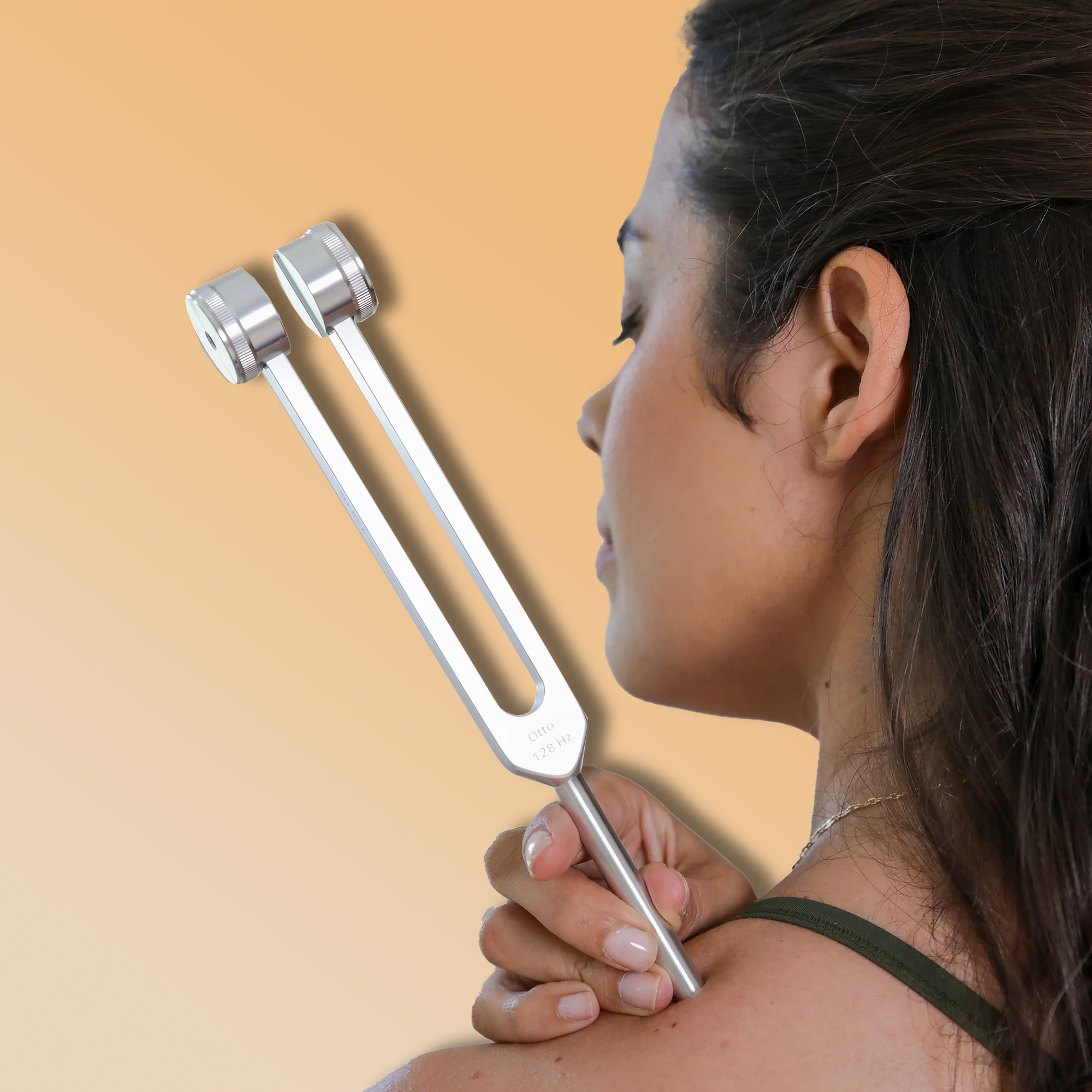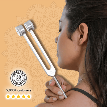 Gently strike the tuning fork and place the base on your chest, neck, or another area of the body. Hold for 10–15 seconds, then repeat for 2–3 minutes while taking slow, deep breaths.